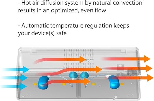 - Sencillo, asequible, fiable. Funcionamiento sencillo con un solo toque que seca tus audífonos en solo 2 horas y 15 minutos. Nuestro sistema de difusión de aire caliente y convección natural te ofrece un secado eficiente de alta calidad, sin romper el banco. El apagado automático garantiza que nunca tendrás que preocuparte por dejar tus dispositivos en demasiado tiempo.